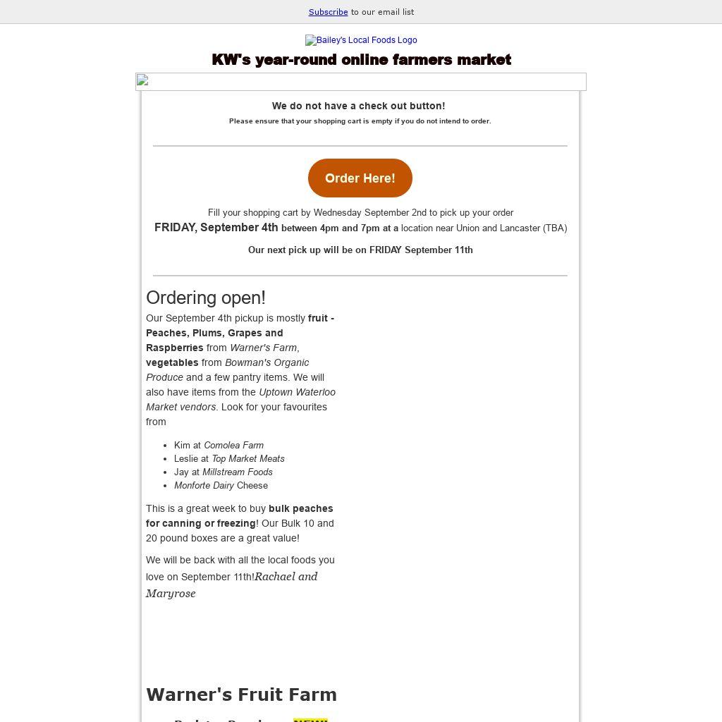 Our September 4th pickup is mostly fruit - Peaches, Plums, Grapes and Raspberries from Warner's Farm, vegetables from Bowman's Organic Produce and a few pantry items. We will also have items from the Uptown Waterloo Market vendors. Look for your favourites from - Kim at Comolea Farm
