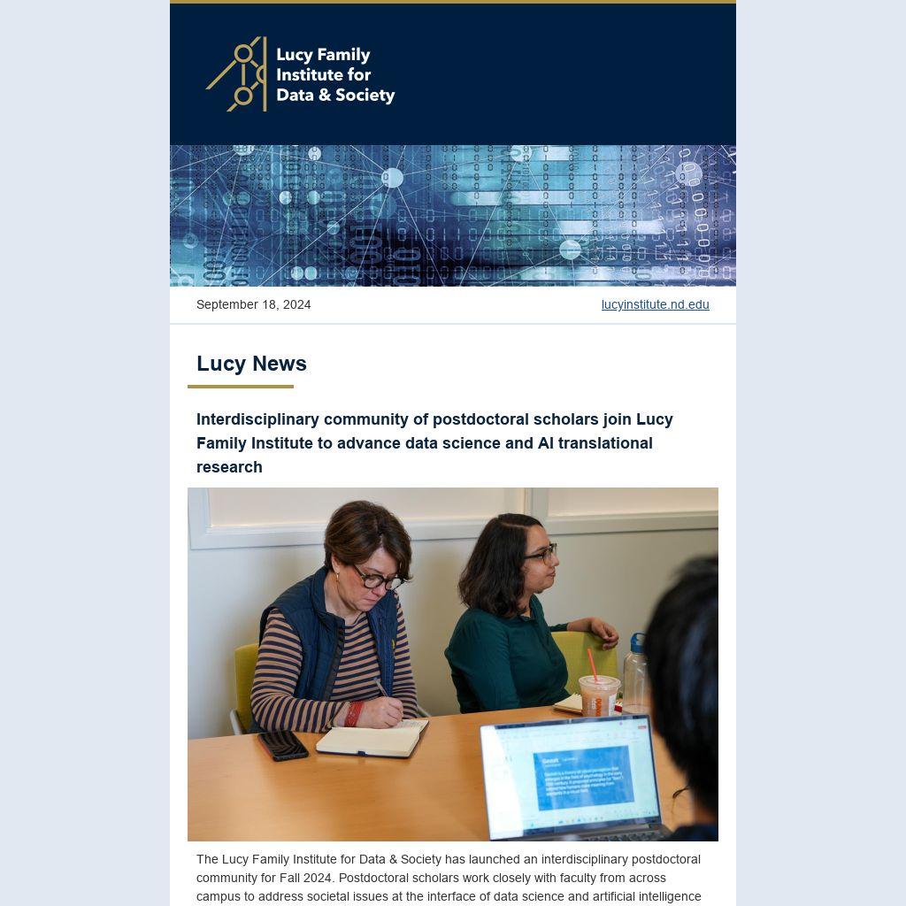 The Lucy Family Institute for Data & Society has launched an interdisciplinary postdoctoral community for Fall 2024. Postdoctoral scholars work closely with faculty from across campus to address societal issues at the interface of data science and artificial intelligence (AI). They also play an integral role in developing the Lucy Family Institute’s programming and in contributing to research within the Institute’s centers and labs.