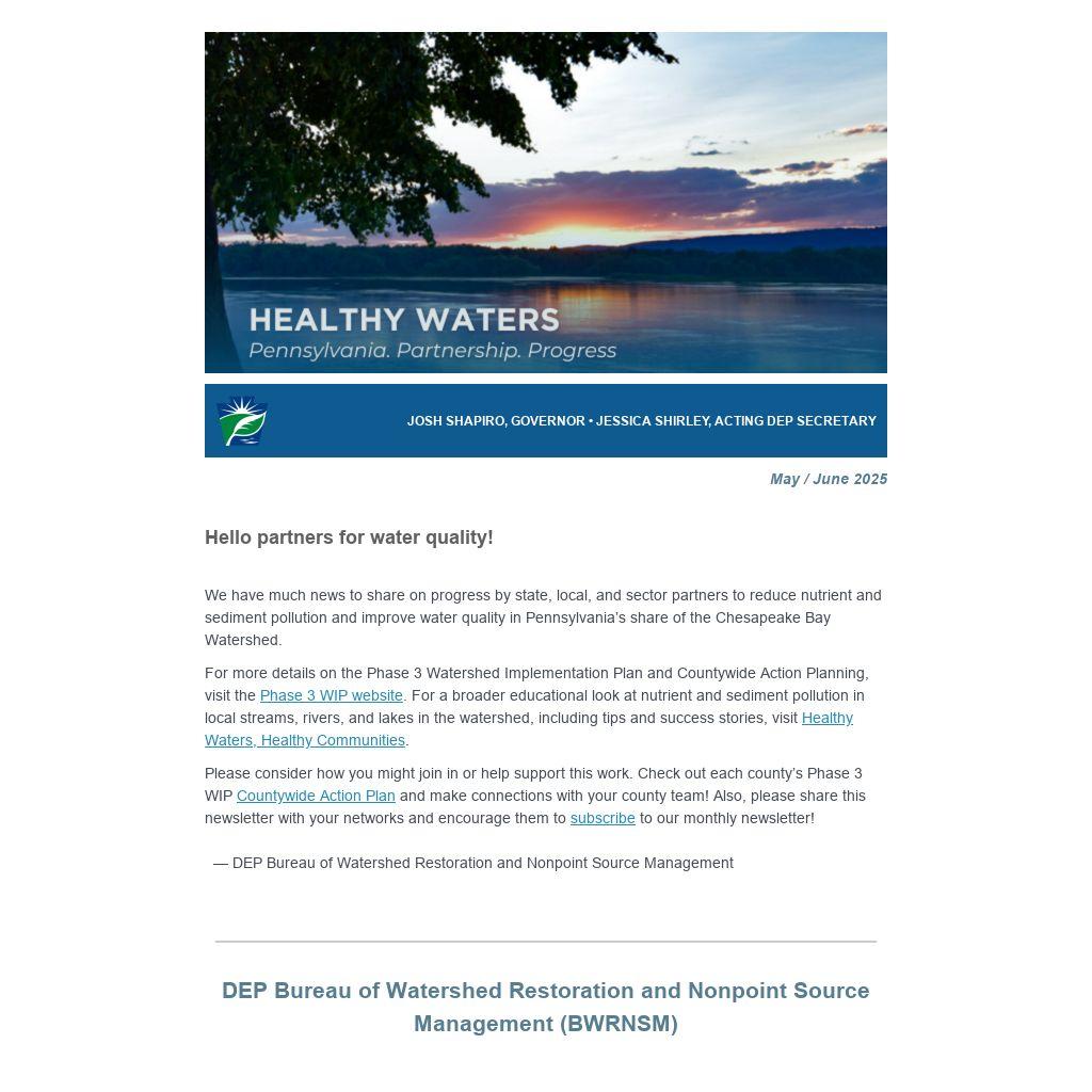 We have much news to share on progress by state, local, and sector partners to reduce nutrient and sediment pollution and improve water quality in Pennsylvania’s share of the Chesapeake Bay Watershed.