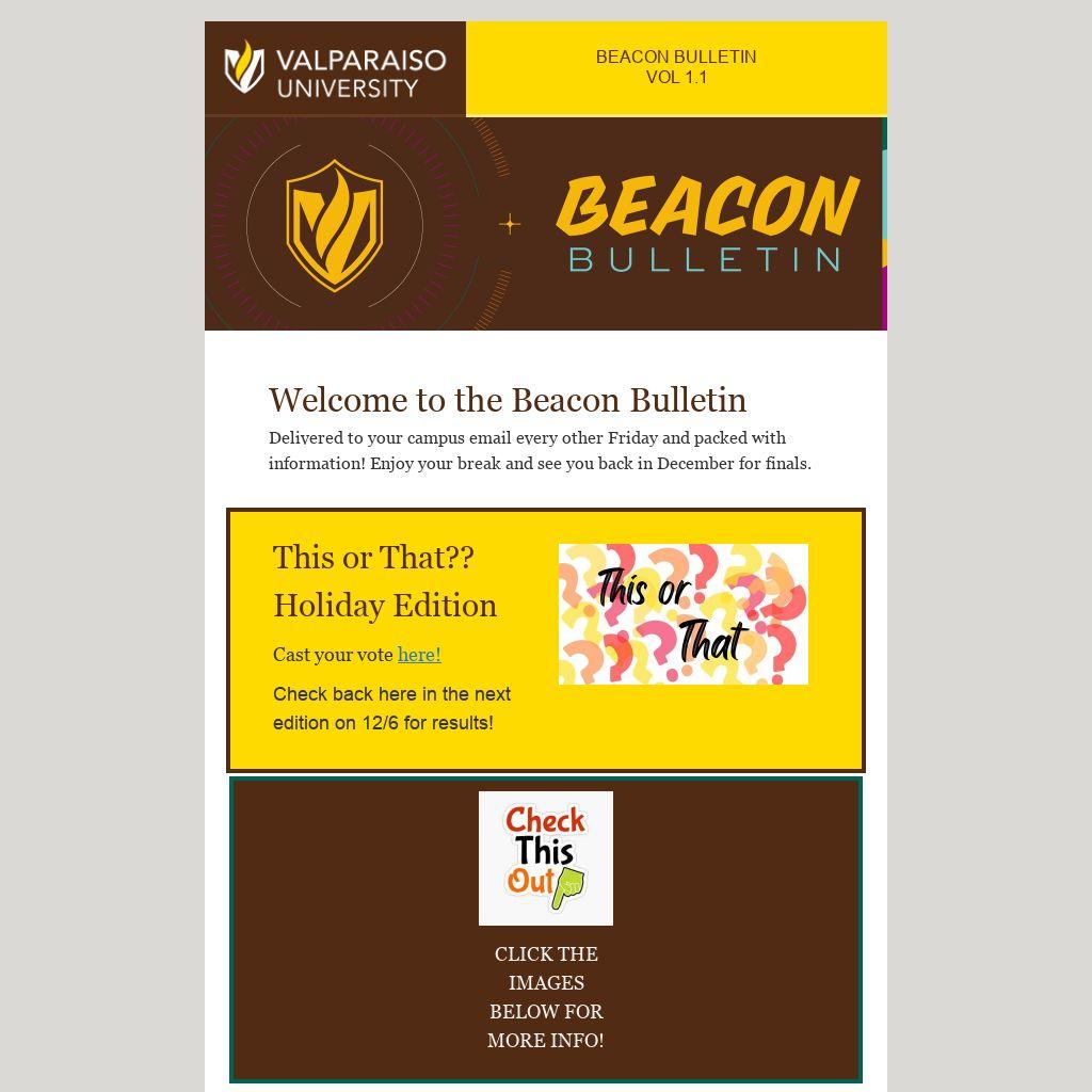 Grad Pop In: December 5th 3- 5:00 pm Duesenberg Welcome Center. Pop in to get more info about VU Graduate School Options. Free Food and Valpo Swag!
