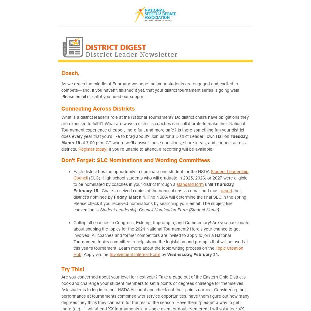 . Chairs received copies of the nominations via email and must report their district’s nominee by Friday, March 1. The NSDA will determine the final SLC in the spring. Please check if you received nominations by searching your email. The subject line convention is Student Leadership Council Nomination Form [Student Name].