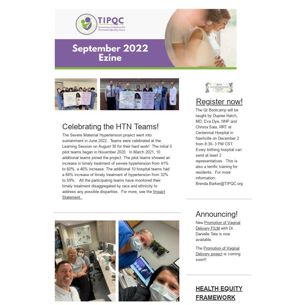 The QI Bootcamp will be taught by Dupree Hatch, MD, Eva Dye, NNP and Christa Sala, RRT at Centennial Hospital in Nashville on December 2 from 8:30- 3 PM CST. Every birthing hospital can send at least 2 representatives. This is also a terrific training for residents. For more information: Brenda.Barker@TIPQC.org