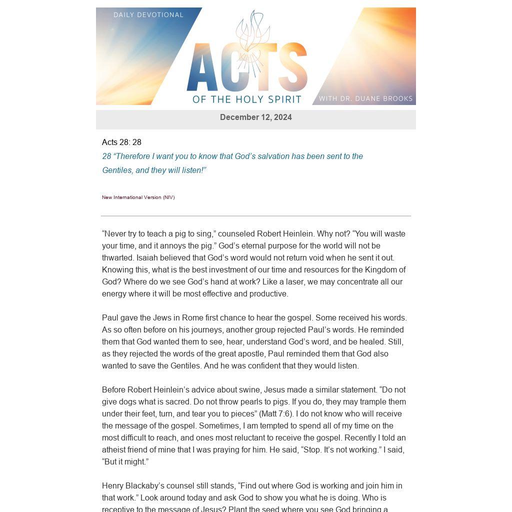 Paul gave the Jews in Rome first chance to hear the gospel. Some received his words. As so often before on his journeys, another group rejected Paul’s words. He reminded them that God wanted them to see, hear, understand God’s word, and be healed. Still, as they rejected the words of the great apostle, Paul reminded them that God also wanted to save the Gentiles. And he was confident that they would listen.