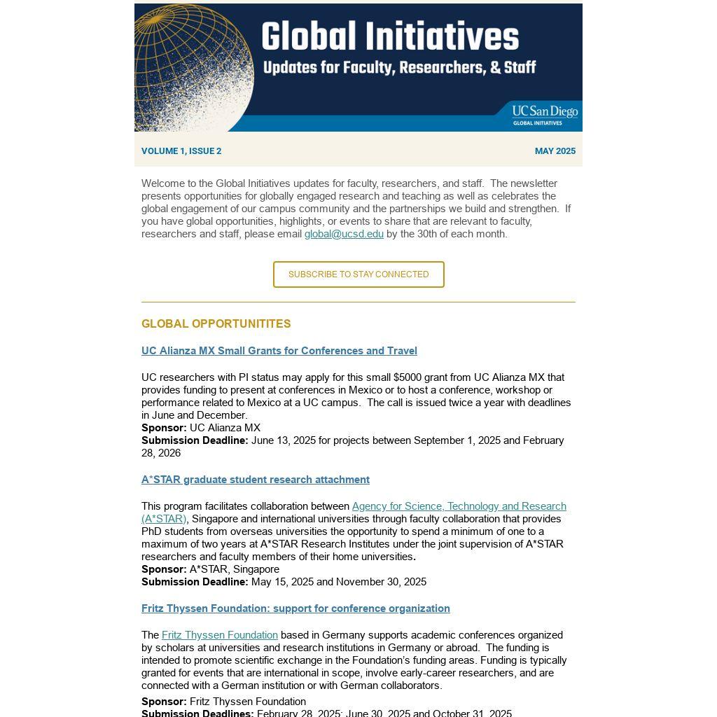Welcome to the Global Initiatives updates for faculty, researchers, and staff. The newsletter presents opportunities for globally engaged research and teaching as well as celebrates the global engagement of our campus community and the partnerships we build and strengthen. If you have global opportunities, highlights, or events to share that are relevant to faculty, researchers and staff, please email global@ucsd.edu by the 30th of each month.