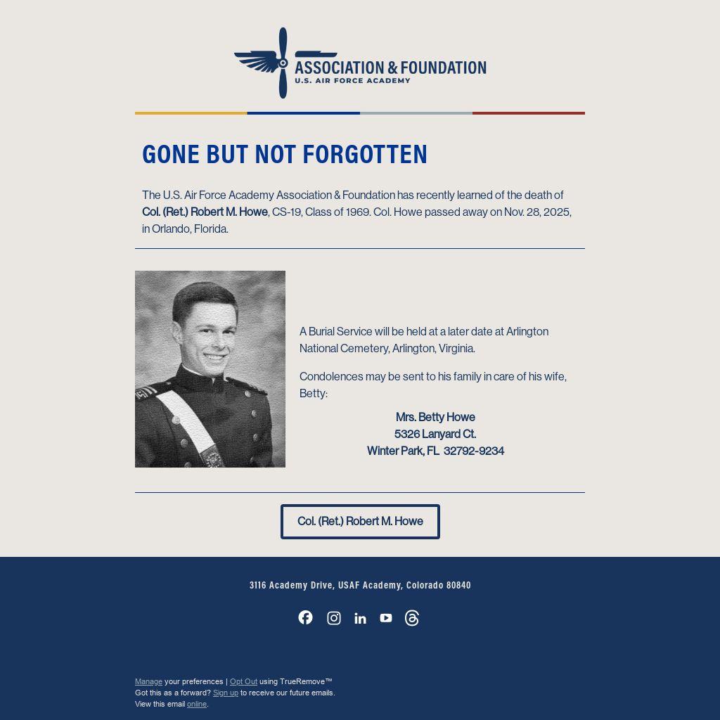 The U.S. Air Force Academy Association & Foundation has recently learned of the death of Col. (Ret.) Robert M. Howe, CS-19, Class of 1969. Col. Howe passed away on Nov. 28, 2025, in Orlando, Florida.