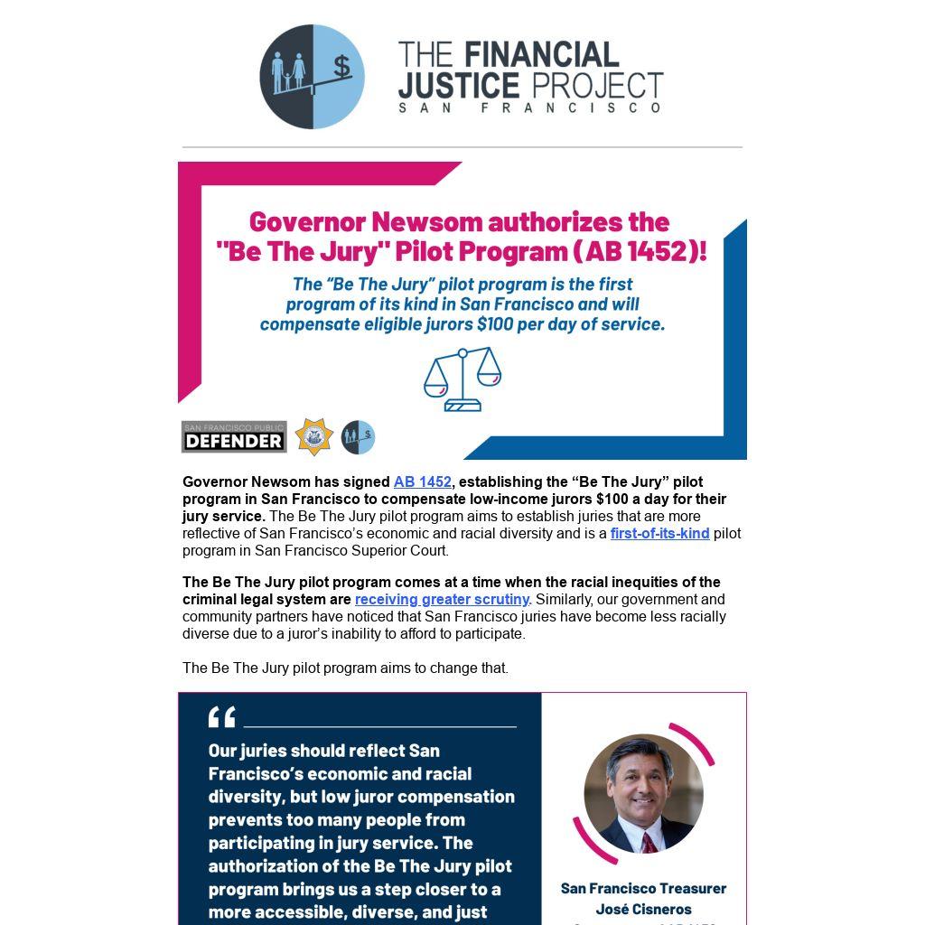 We shouldn’t be pricing people out of jury duty. Now that the Be The Jury pilot program has been authorized, more people will be able to engage in a fundamental civic duty. We plan to launch the pilot with our partners in San Francisco in January 2022.