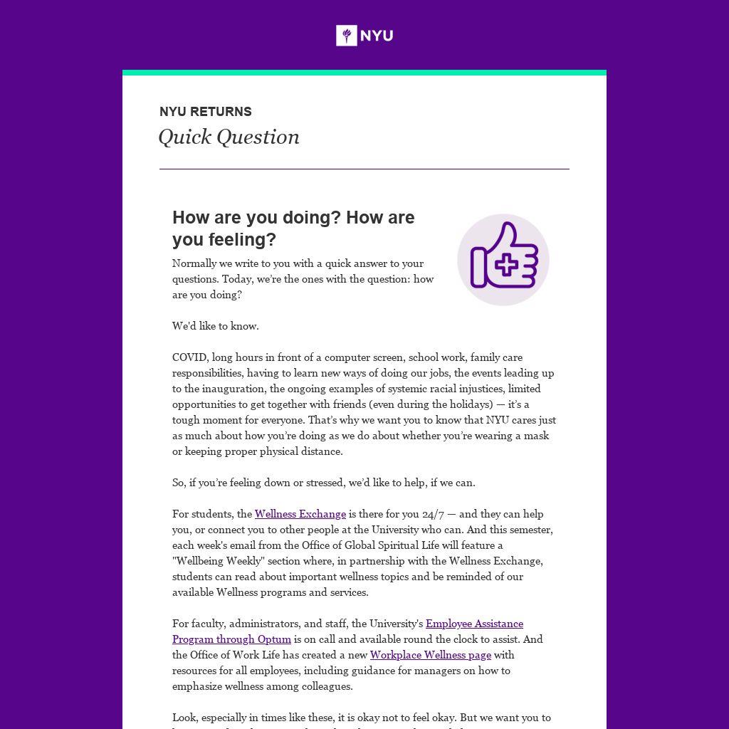 COVID, long hours in front of a computer screen, school work, family care responsibilities, having to learn new ways of doing our jobs, the events leading up to the inauguration, the ongoing examples of systemic racial injustices, limited opportunities to get together with friends (even during the holidays) — it’s a tough moment for everyone. That’s why we want you to know that NYU cares just as much about how you’re doing as we do about whether you’re wearing a mask or keeping proper physical distance.