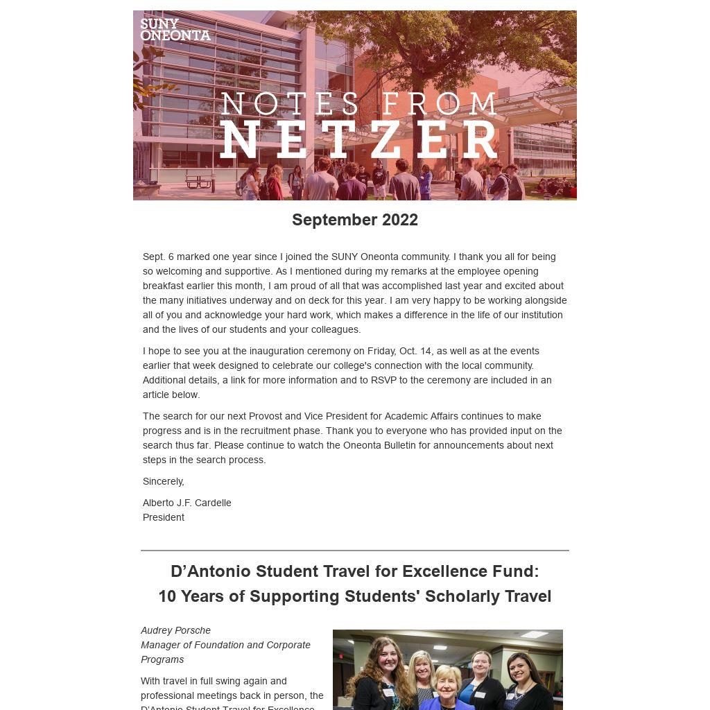 Sept. 6 marked one year since I joined the SUNY Oneonta community. I thank you all for being so welcoming and supportive. As I mentioned during my remarks at the employee opening breakfast earlier this month, I am proud of all that was accomplished last year and excited about the many initiatives underway and on deck for this year. I am very happy to be working alongside all of you and acknowledge your hard work, which makes a difference in the life of our institution and the lives of our students and your colleagues.