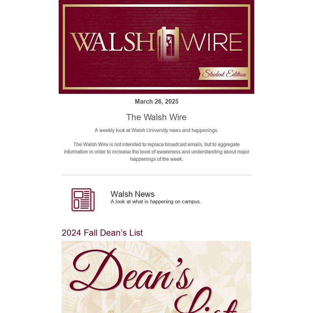 The Walsh Wire is not intended to replace broadcast emails, but to aggregate information in order to increase the level of awareness and understanding about major happenings of the week.