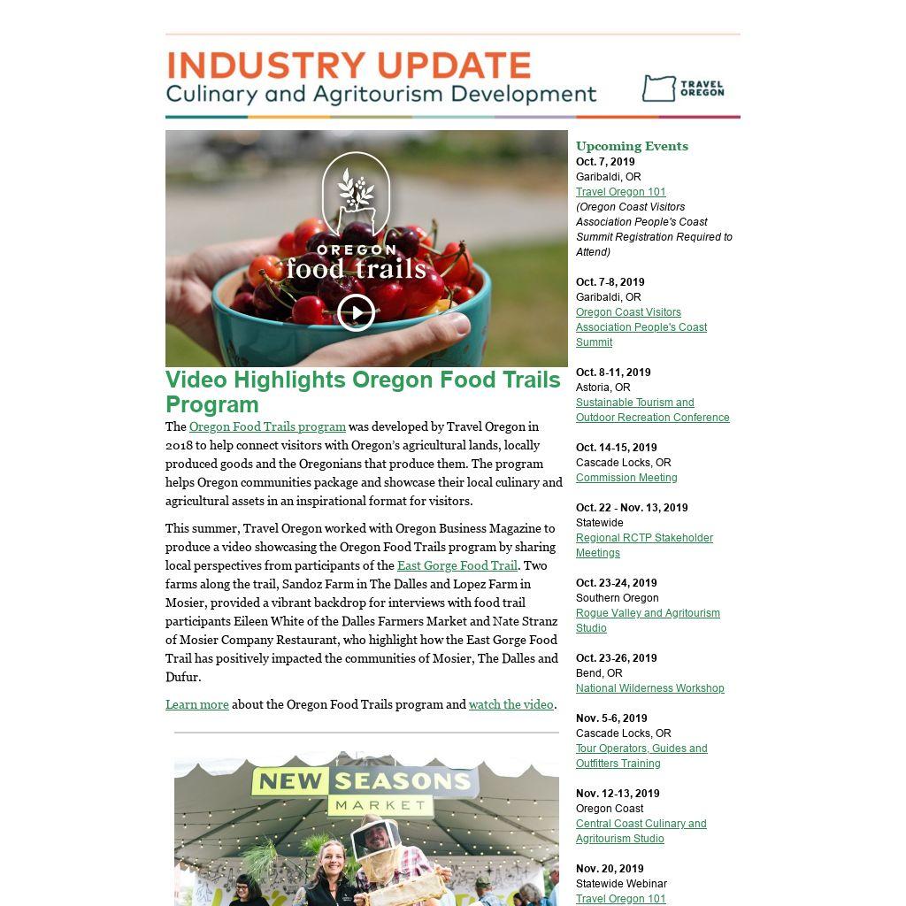 Video Highlights Oregon Food Trails ProgramThe Oregon Food Trails program was developed by Travel Oregon in 2018 to help connect visitors with Oregon’s agricultural lands, locally produced goods and the Oregonians that produce them. The program helps Oregon communities package and showcase their local culinary and agricultural assets in an inspirational format for visitors.