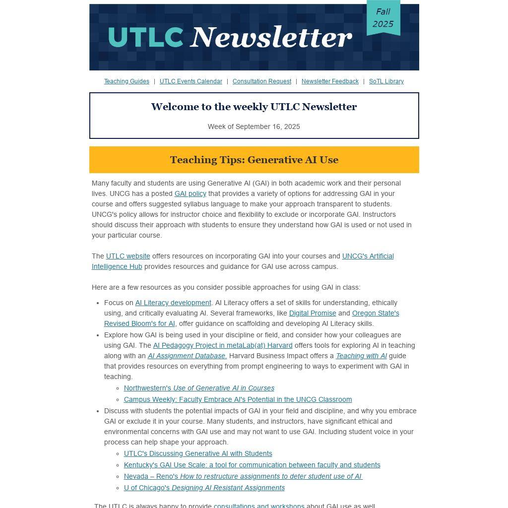 The UTLC website offers resources on incorporating GAI into your courses and UNCG's Artificial Intelligence Hub provides resources and guidance for GAI use across campus.