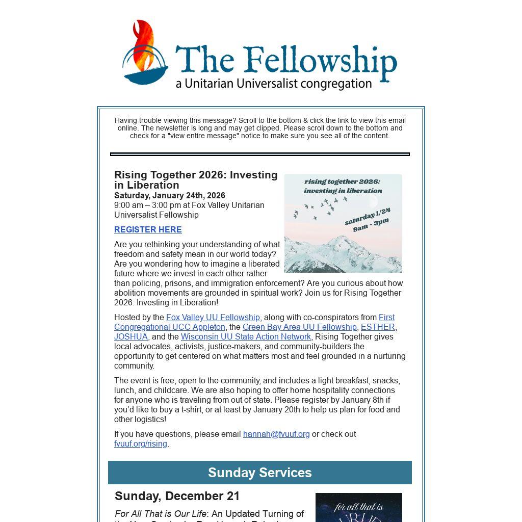 Are you rethinking your understanding of what freedom and safety mean in our world today? Are you wondering how to imagine a liberated future where we invest in each other rather than policing, prisons, and immigration enforcement? Are you curious about how abolition movements are grounded in spiritual work? Join us for Rising Together 2026: Investing in Liberation!