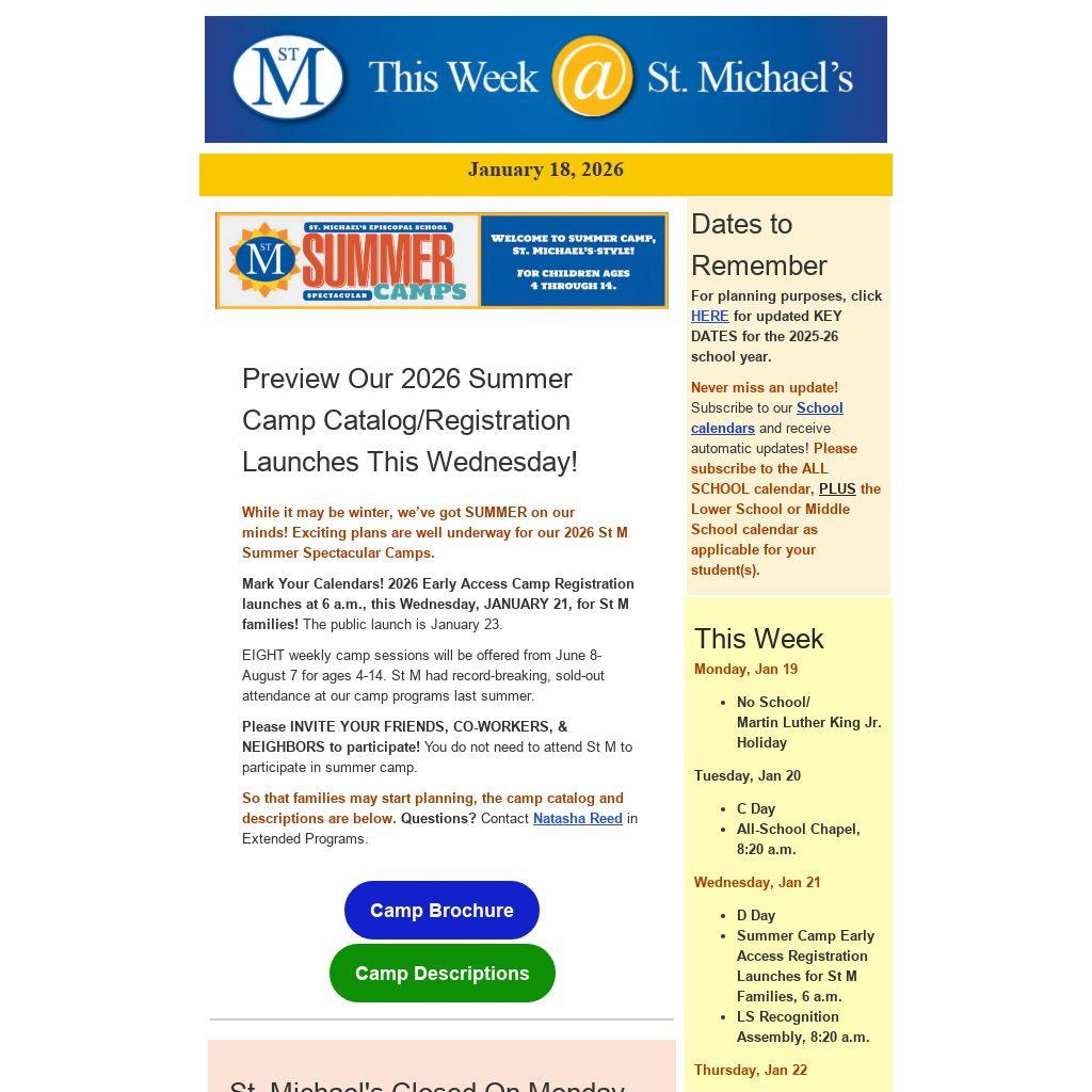 Mark Your Calendars! 2026 Early Access Camp Registration launches at 6 a.m., this Wednesday, JANUARY 21, for St M families! The public launch is January 23.