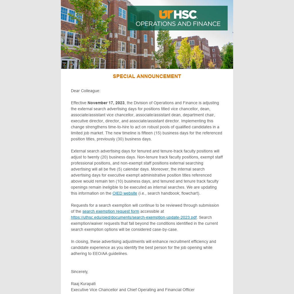 Requests for a search exemption will continue to be reviewed through submission of the search exemption request form accessible at https://uthsc.edu/oied/documents/search-exemption-update-2023.pdf. Search exemption/waiver requests that fall beyond the conditions identified in the current search exemption options will be considered case-by-case.