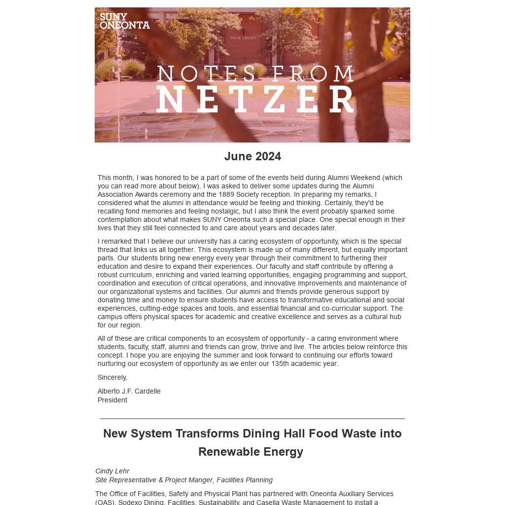 Notes from meetings of the President's Cabinet are shared with the university community monthly in Notes from Netzer. Questions can be directed to president@oneonta.edu.