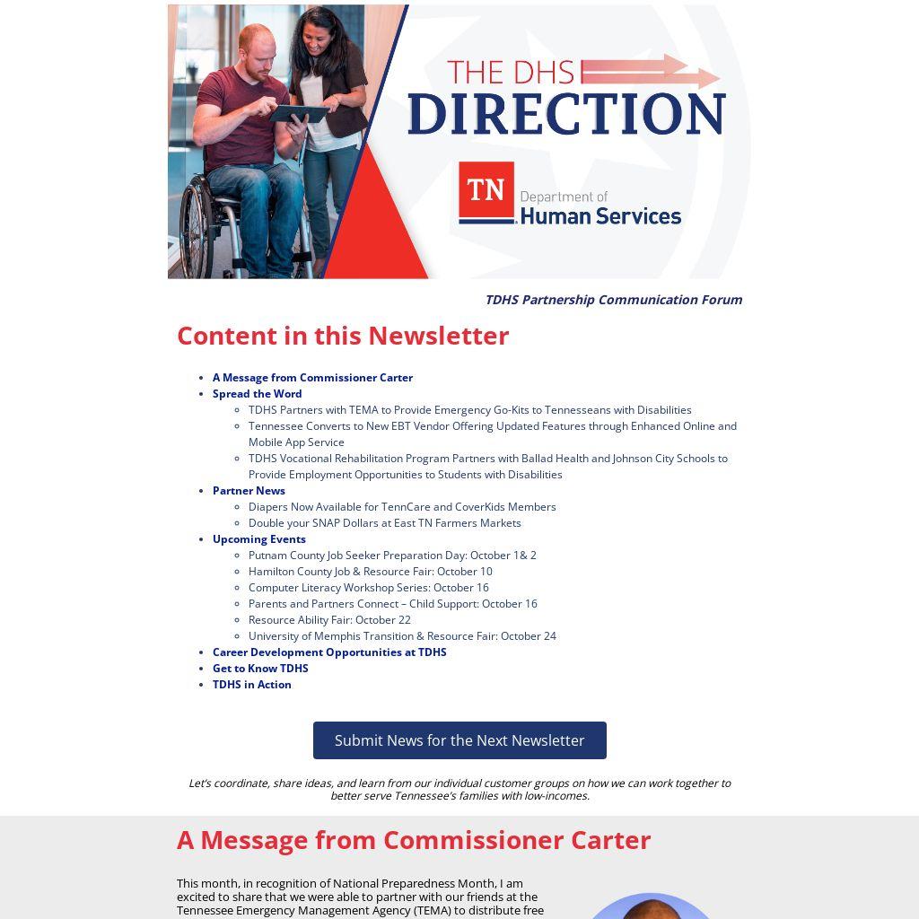 This month, in recognition of National Preparedness Month, I am excited to share that we were able to partner with our friends at the Tennessee Emergency Management Agency (TEMA) to distribute free emergency go-kits to Tennesseans who are deaf, hard of hearing, blind, and have low vision. Each Go-Kit includes essential emergency preparedness items, such as a Midland Weather Radio, Midland SBNDL Bundle Kit (strobe light, pillow shaker, batteries, etc.), and a family First Aid Kit. The kits will be available on a first-come, first-served basis at ten TDHS Vocational Rehabilitation affiliated locations across the state. We encourage you to contact the center before visiting.