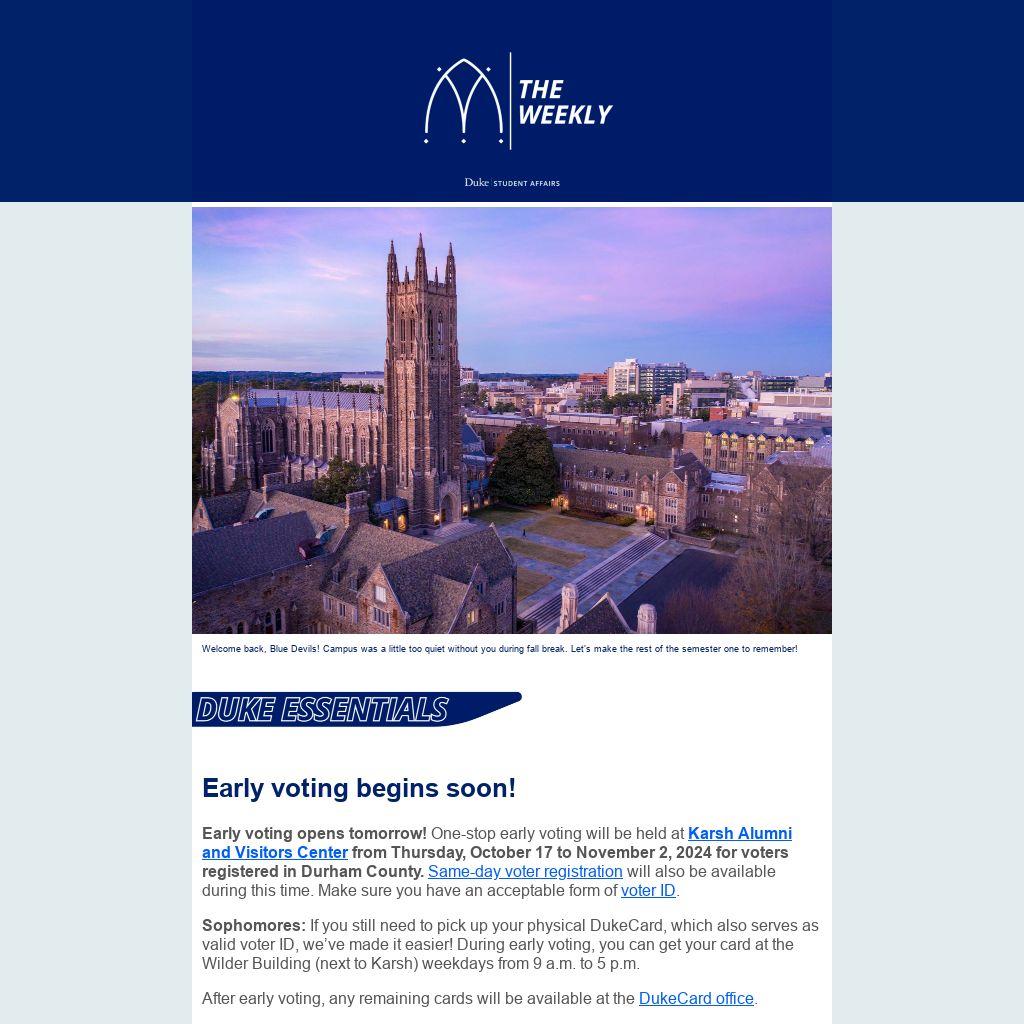 Early voting opens tomorrow! One-stop early voting will be held at Karsh Alumni and Visitors Center from Thursday, October 17 to November 2, 2024 for voters registered in Durham County. Same-day voter registration will also be available during this time. Make sure you have an acceptable form of voter ID.