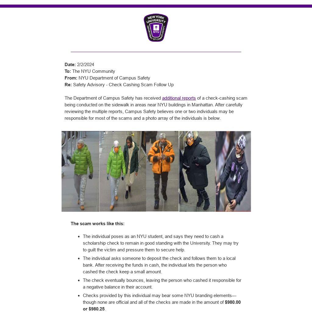 Campus Safety has notified local law enforcement regarding this scheme. If you see these individuals, or are asked by someone on the street to cash a check made out for the above amounts, please do not engage and contact 911 and then Campus Safety at 212.998.2222.