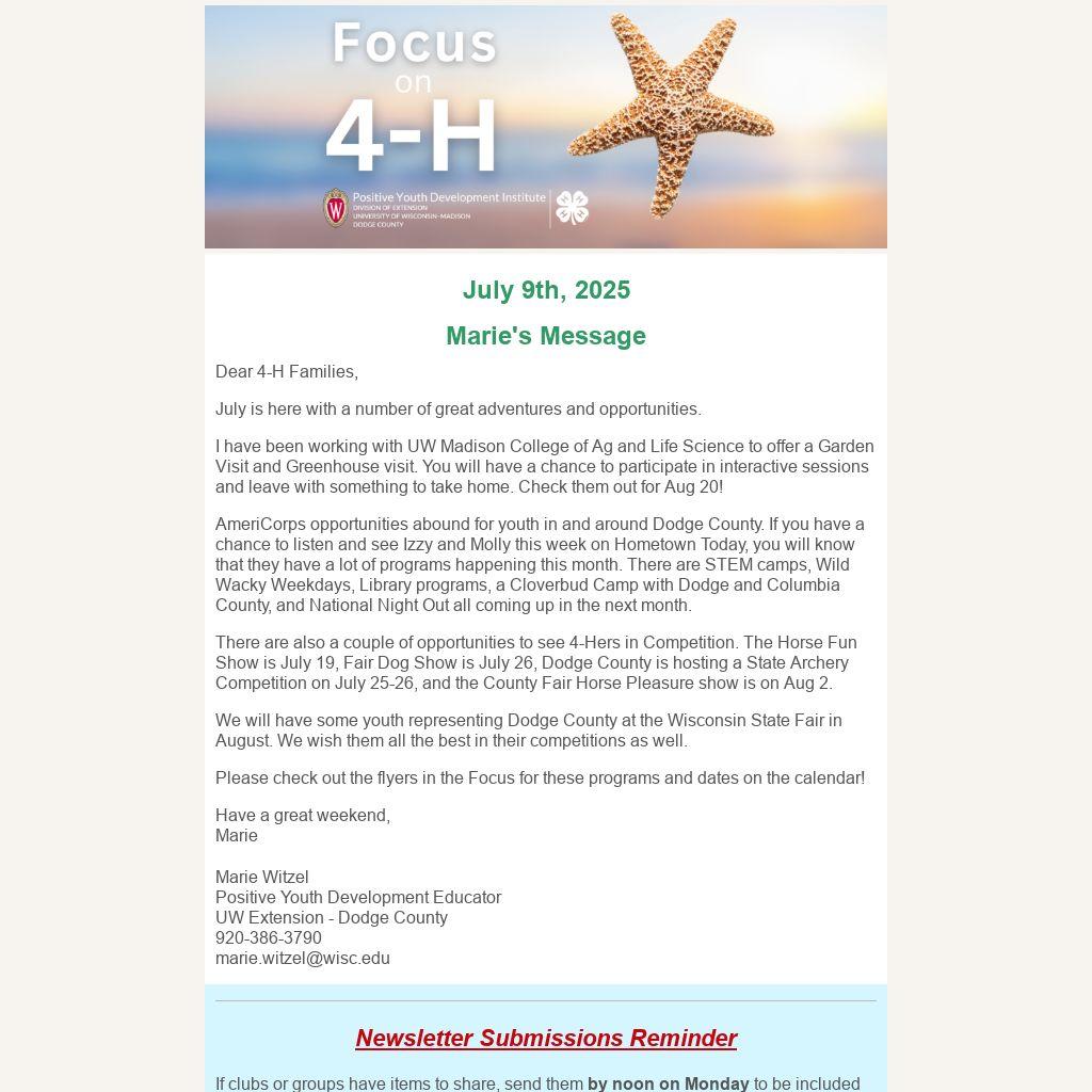 If clubs or groups have items to share, send them by noon on Monday to be included in that week’s issue. Anything received after 12 p.m. Monday will be considered for the following week. Secretary Minutes need to go to Marie now too. The articles should be sent to Marie at marie.witzel@wisc.edu.