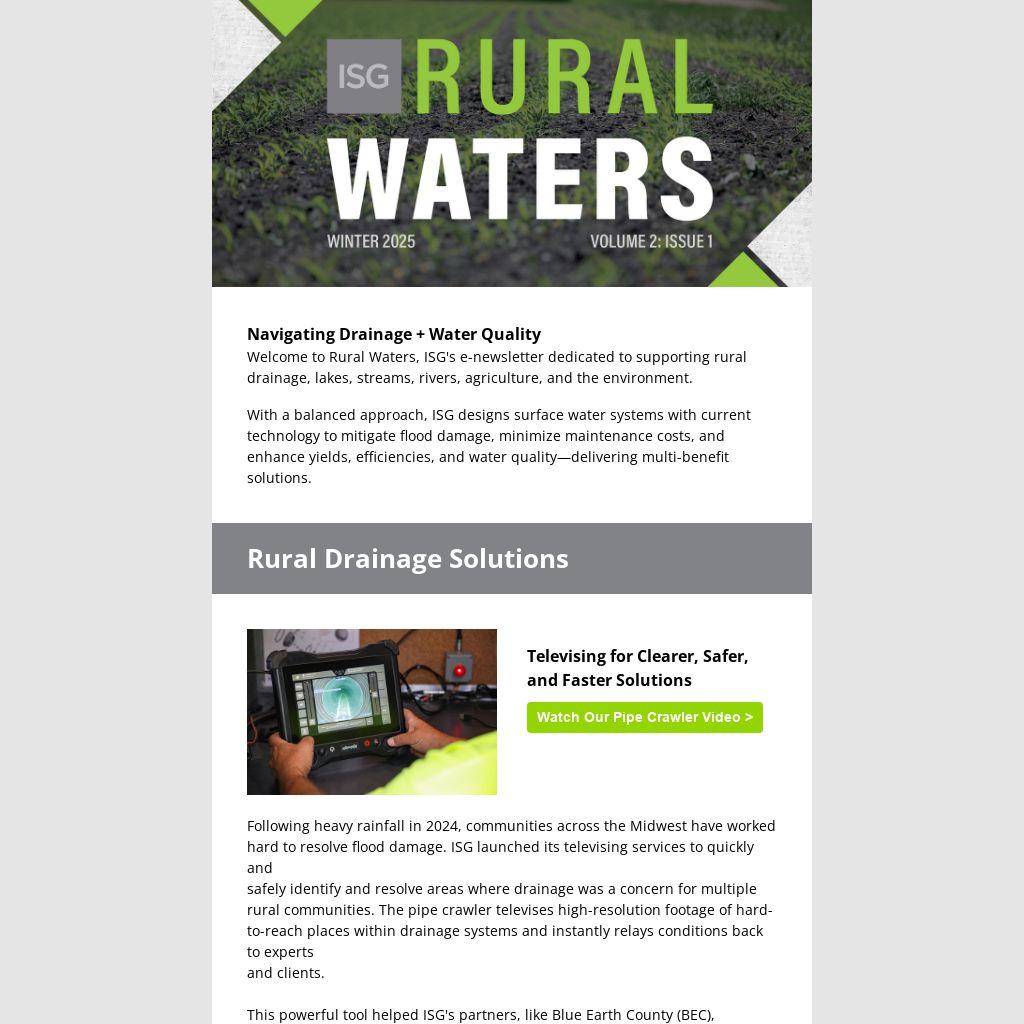 Welcome to Rural Waters, ISG's e-newsletter dedicated to supporting rural drainage, lakes, streams, rivers, agriculture, and the environment.