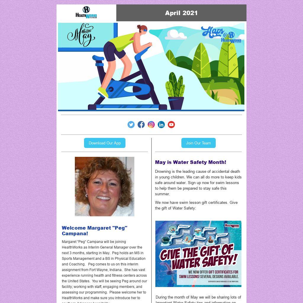 May is here and another busy and full month! National Health and Fitness month for Senior Adults; National Bike Month; Mother’s Day and Memorial Day; National Family Wellness month; National Blood Pressure Education Month; Women’s Health Month; National Physical Fitness and Sports Month; Cinco De Mayo.....WOW!!! Seems like we have a day or a month for everyone and everything but, the bottom line is always the same.....Make time for yourself and for those that you love. Get a workout partner or join a group fitness class, see your physician and your dentist for regular checkups, try something new and fun to get you moving, walk your dog, come swim in the pool and lay out on the deck, just breathe and remember it’s going to be just fine.