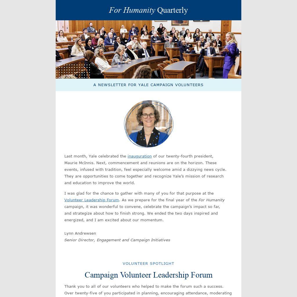 We want to hear from you! To share questions, ideas, or your thoughts on how the campaign leadership team can best support you as you promote For Humanity, email Lynn Andrewsen, senior director, engagement and campaign initiatives, at lynn.andrewsen@yale.edu.
