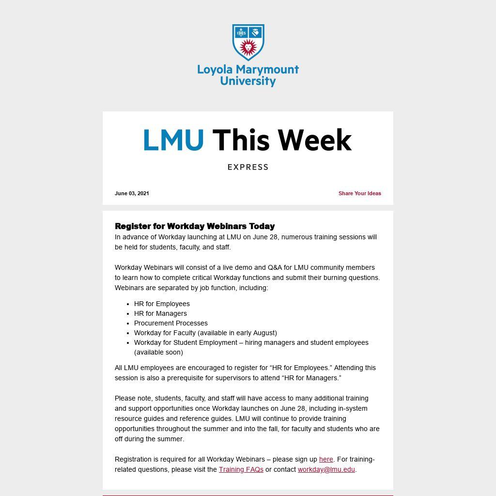 Registration is required for all Workday Webinars – please sign up here. For training-related questions, please visit the Training FAQs or contact workday@lmu.edu.