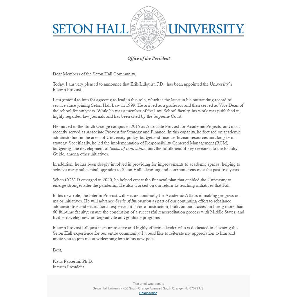 Interim Provost Lillquist is an innovative and highly effective leader who is dedicated to elevating the Seton Hall experience for our entire community. I would like to reiterate my appreciation to him and invite you to join me in welcoming him to his new post.