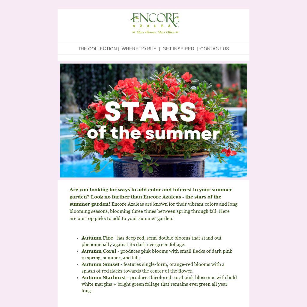 Are you looking for ways to add color and interest to your summer garden? Look no further than Encore Azaleas - the stars of the summer garden! Encore Azaleas are known for their vibrant colors and long blooming seasons, blooming three times between spring through fall. Here are our top picks to add to your summer garden: