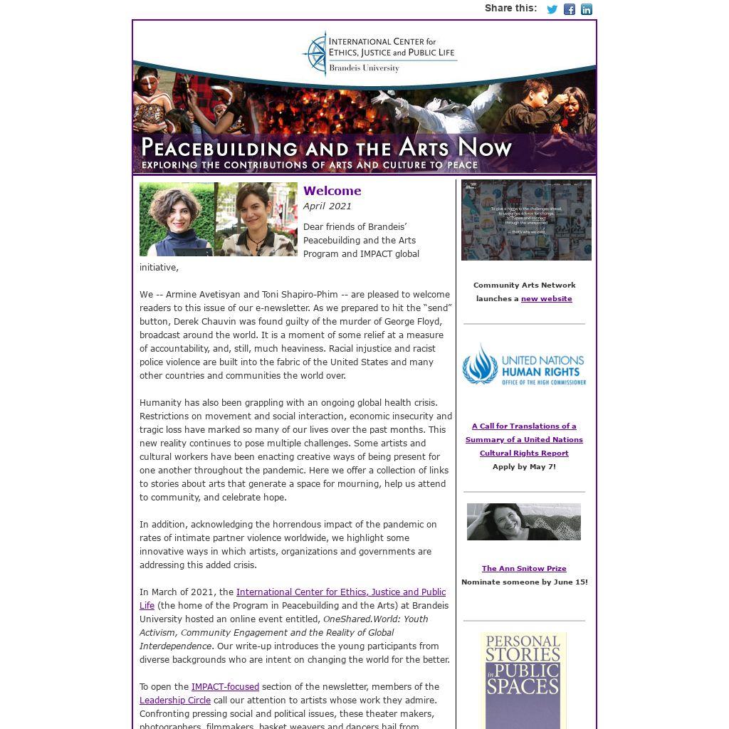 Dear friends of Brandeis’ Peacebuilding and the Arts Program and IMPACT global initiative, We -- Armine Avetisyan and Toni Shapiro-Phim -- are pleased to welcome readers to this issue of our e-newsletter. As we prepared to hit the “send” button, Derek Chauvin was found guilty of the murder of George Floyd, broadcast around the world. It is a moment of some relief at a measure of accountability, and, still, much heaviness. Racial injustice and racist police violence are built into the fabric of the United States and many other countries and communities the world over. Humanity has also been grappling with an ongoing global health crisis. Restrictions on movement and social interaction, economic insecurity and tragic loss have marked so many of our lives over the past months. This new reality continues to pose multiple challenges. Some artists and cultural workers have been enacting creative ways of being present for one another throughout the pandemic. Here we offer a collection of links to stories about arts that generate a space for mourning, help us attend to community, and celebrate hope. In addition, acknowledging the horrendous impact of the pandemic on rates of intimate partner violence worldwide, we highlight some innovative ways in which artists, organizations and governments are addressing this added crisis. In March of 2021, the International Center for Ethics, Justice and Public Life (the home of the Program in Peacebuilding and the Arts) at Brandeis University hosted an online event entitled, OneShared.World: Youth Activism, Community Engagement and the Reality of Global Interdependence. Our write-up introduces the young participants from diverse backgrounds who are intent on changing the world for the better. To open the IMPACT-focused section of the newsletter, members of the Leadership Circle call our attention to artists whose work they admire. Confronting pressing social and political issues, these theater makers, photographers, filmmakers, basket weavers and dancers hail from Argentina, Israel, the Netherlands, Serbia, Turkey and the United States. Carmen Olaechea, then, shares her perspective on a paradigm shift concerning the relationship between sustainability and culture, in both English and Spanish, and Ellada Evangelou writes about the emerging partnership between IMPACT and The Festival Academy, a global community of more than 800 festival managers from 95 countries. Our Upcoming Events and Resources and Announcements sections feature a call for translations of the short summary of a United Nations report on the devastating toll of the COVID-19 pandemic on culture and cultural rights, an invitation to listen to a new podcast series about the arts and peacebuilding, a link to a guide for artists facing persecution, and more. We’re grateful for the time you spend perusing the stories and information included in the newsletter, and for your contributions toward more vibrant, just and peaceful communities. As always, we’d appreciate your feedback, and your news. Do take care, Armine (IMPACT Program Manager) and Toni (Assistant Director of the Program in Peacebuilding and the Arts)