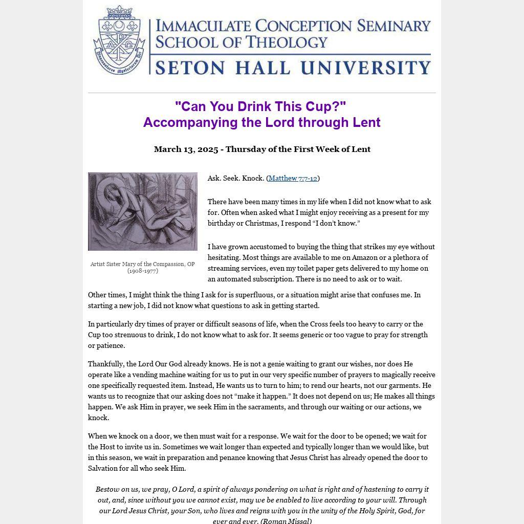 Thankfully, the Lord Our God already knows. He is not a genie waiting to grant our wishes, nor does He operate like a vending machine waiting for us to put in our very specific number of prayers to magically receive one specifically requested item. Instead, He wants us to turn to him; to rend our hearts, not our garments. He wants us to recognize that our asking does not “make it happen.” It does not depend on us; He makes all things happen. We ask Him in prayer, we seek Him in the sacraments, and through our waiting or our actions, we knock.