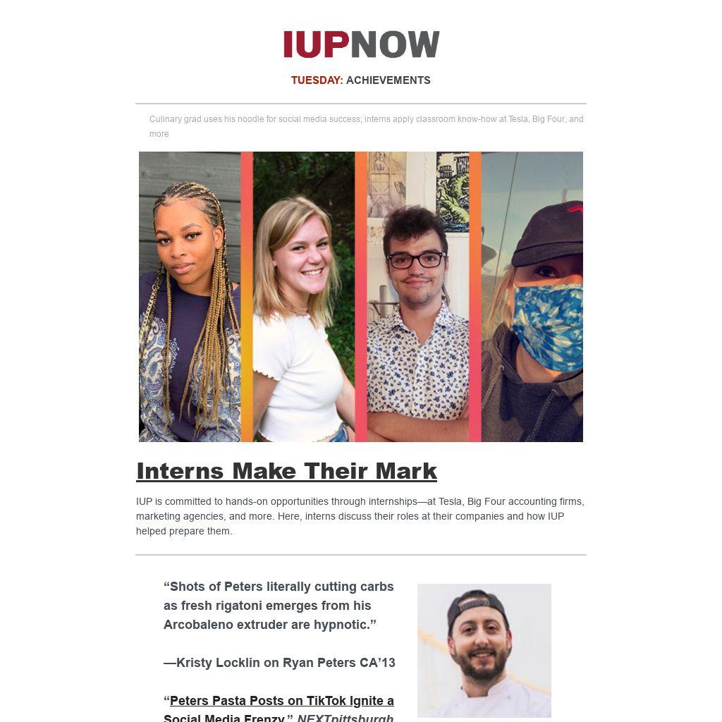 Distributed to IUP employees and students three days a week on its summer schedule, IUP Now is the official newsletter of Indiana University of Pennsylvania. It features news from across the IUP website, compiled by the Division of Marketing and Communications. Find out how to get your news and events in IUP Now.