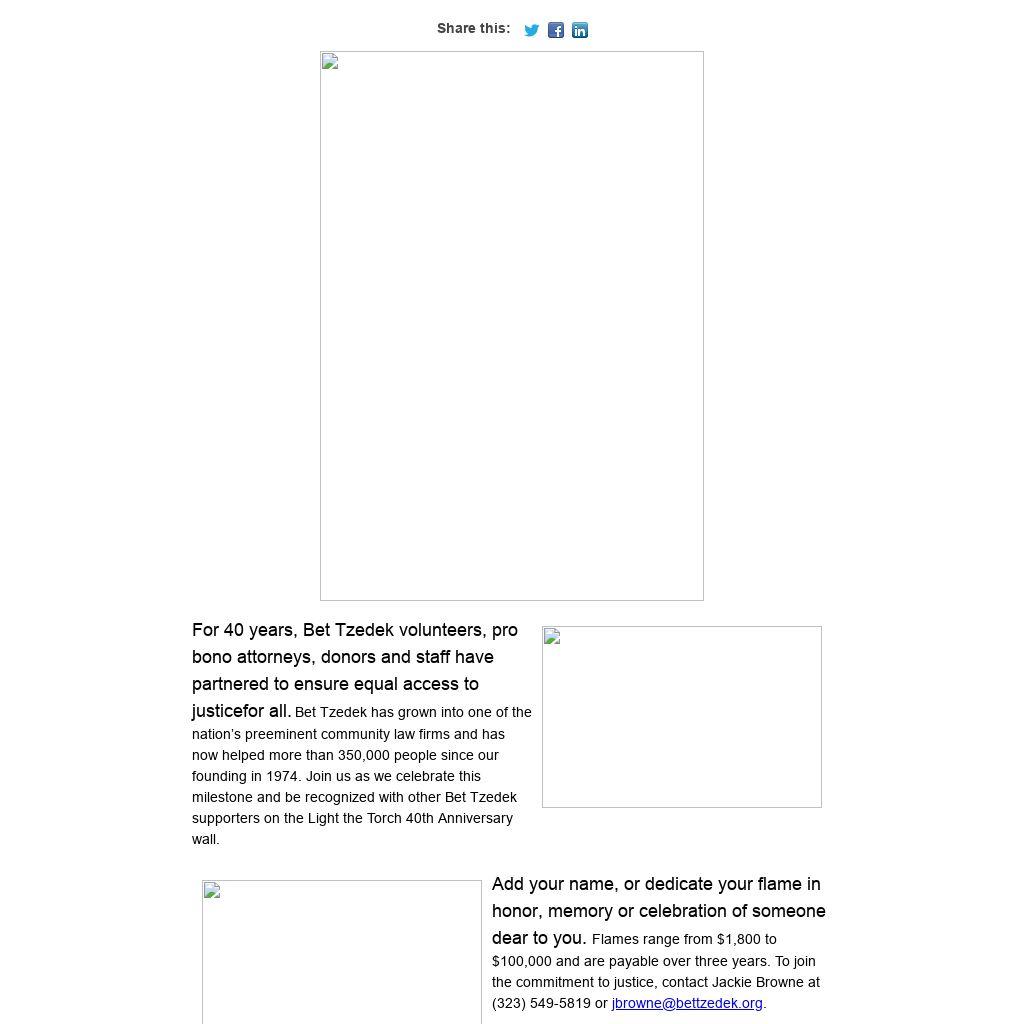 For 40 years, Bet Tzedek volunteers, pro bono attorneys, donors and staff have partnered to ensure equal access to justicefor all. Bet Tzedek has grown into one of the nation’s preeminent community law firms and has now helped more than 350,000 people since our founding in 1974. Join us as we celebrate this milestone and be recognized with other Bet Tzedek supporters on the Light the Torch 40th Anniversary wall.