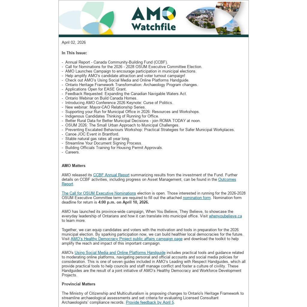 AMO has launched its province-wide campaign, When You Believe, They Believe, to showcase the everyday leadership of Ontarians and how it can translate into municipal office. Visit whenyoubelieve.ca to learn more.