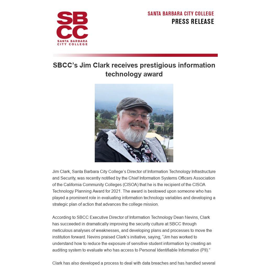 Jim Clark, Santa Barbara City College’s Director of Information Technology Infrastructure and Security, was recently notified by the Chief Information Systems Officers Association of the California Community Colleges (CISOA) that he is the recipient of the CISOA Technology Planning Award for 2021. The award is bestowed upon someone who has played a prominent role in evaluating information technology variables and developing a strategic plan of action that advances the college mission.
