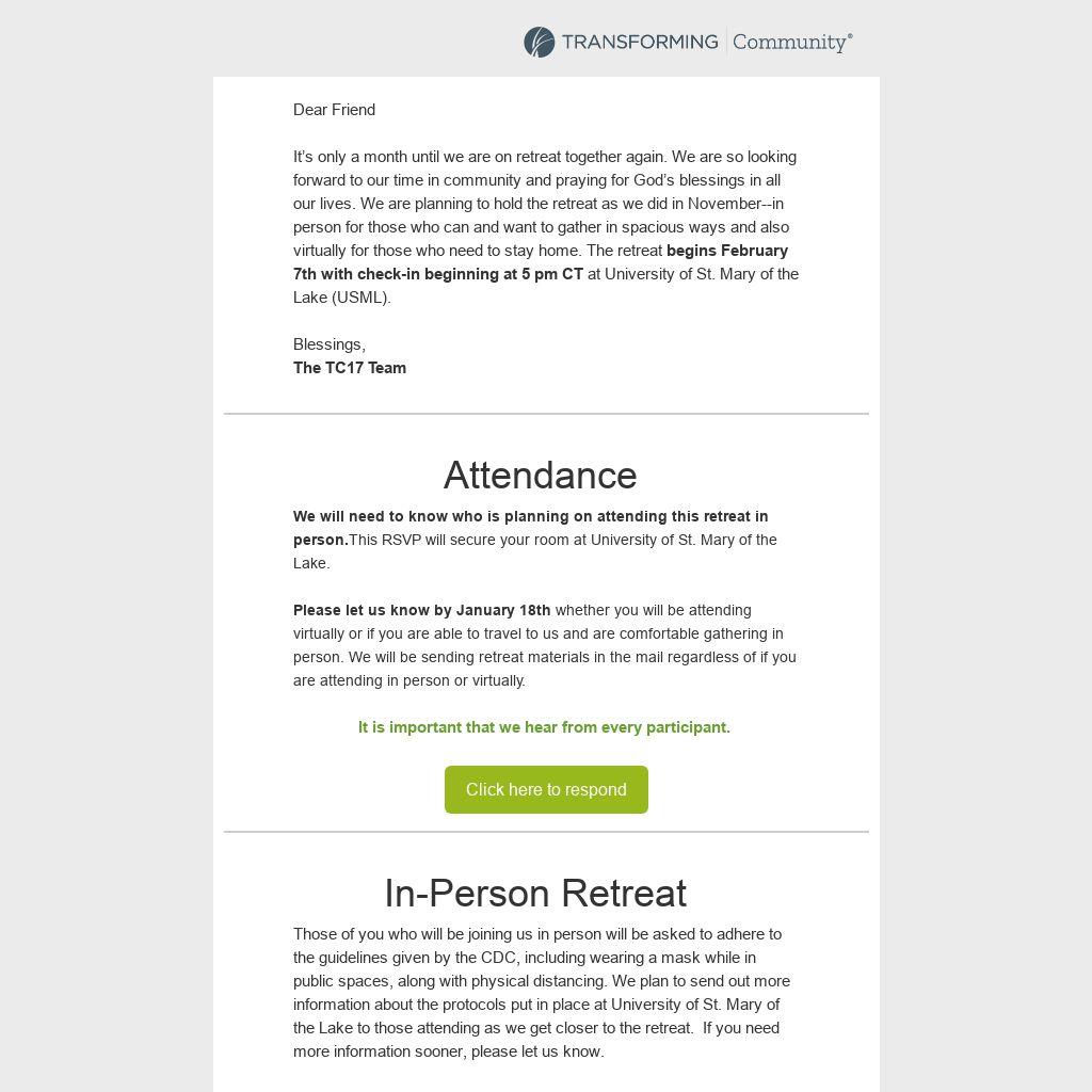 Please let us know by January 18th whether you will be attending virtually or if you are able to travel to us and are comfortable gathering in person. We will be sending retreat materials in the mail regardless of if you are attending in person or virtually.