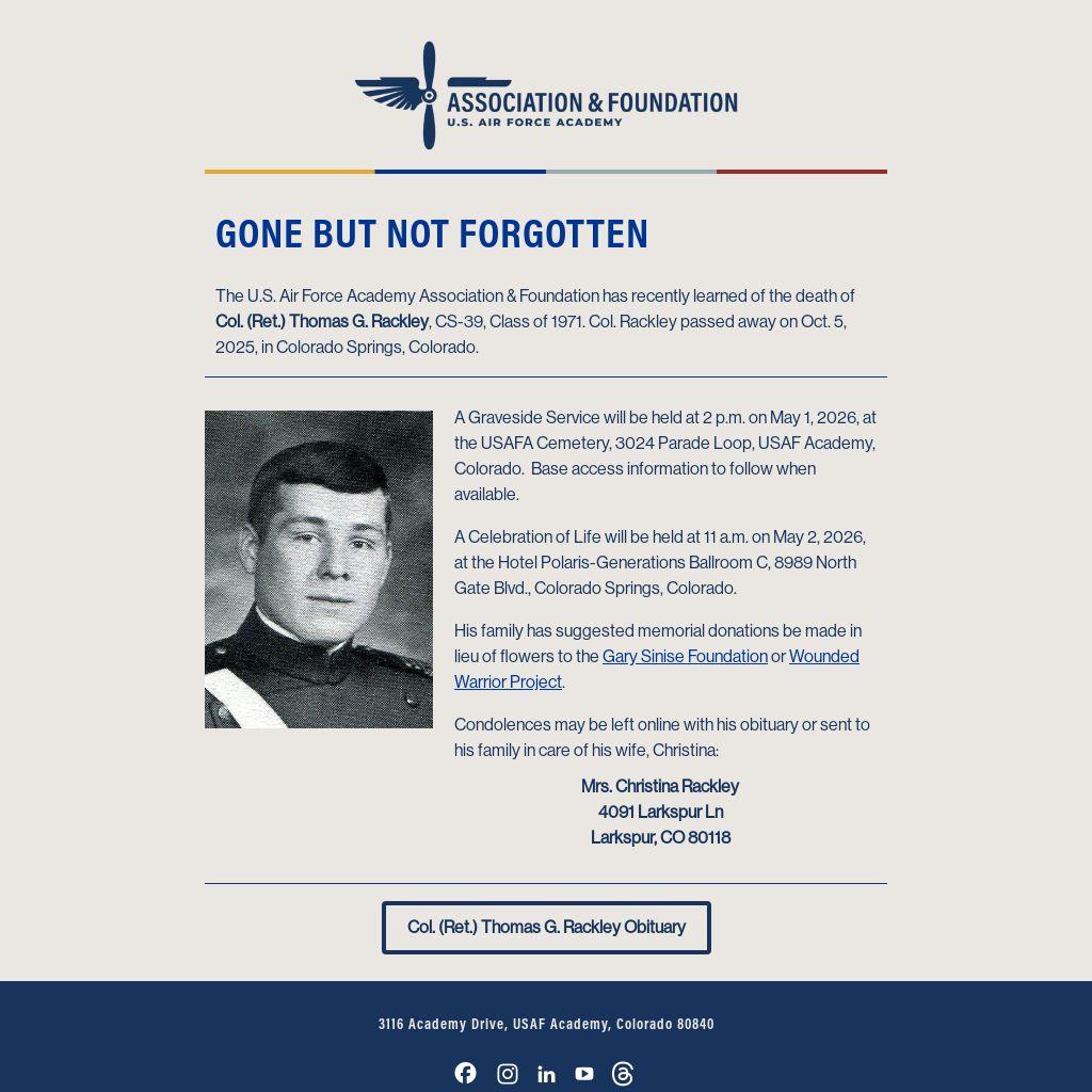 A Graveside Service will be held at 2 p.m. on May 1, 2026, at the USAFA Cemetery, 3024 Parade Loop, USAF Academy, Colorado. Base access information to follow when available.