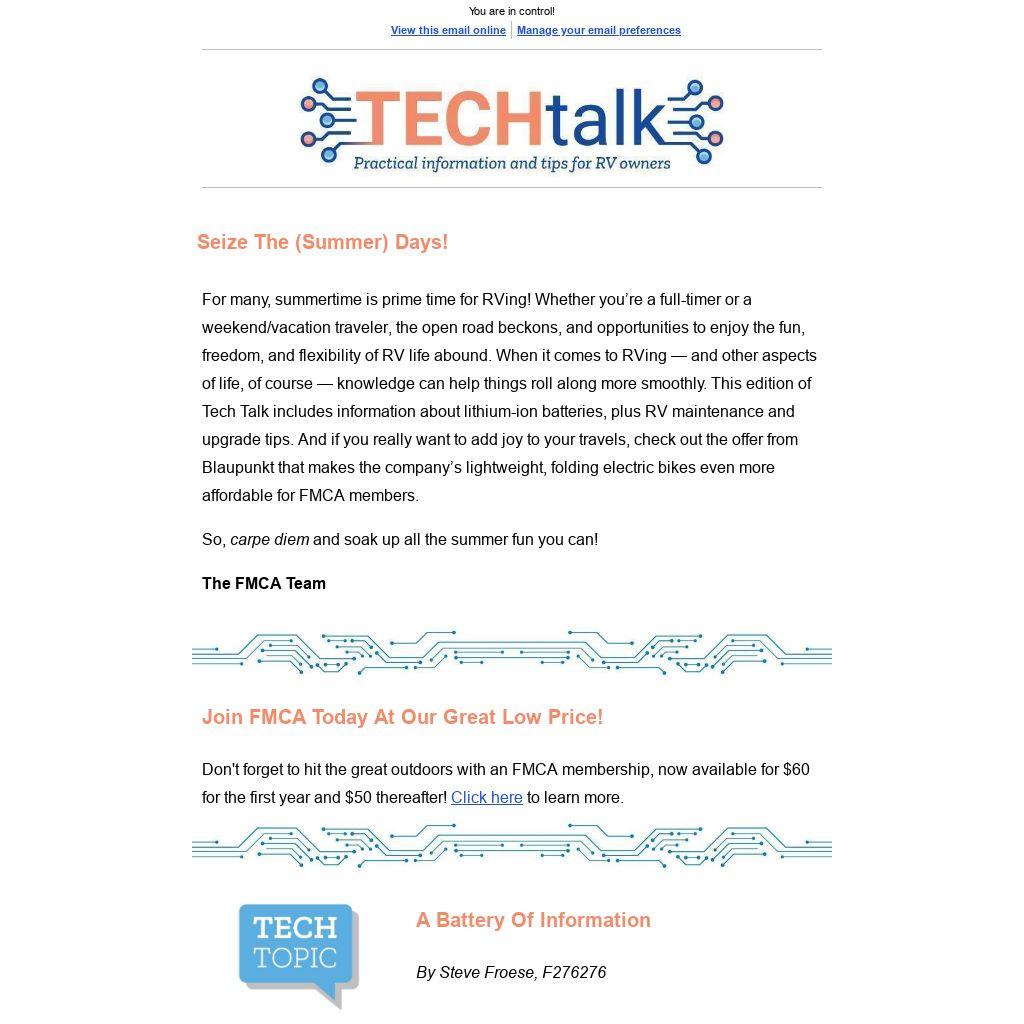 For many, summertime is prime time for RVing! Whether you’re a full-timer or a weekend/vacation traveler, the open road beckons, and opportunities to enjoy the fun, freedom, and flexibility of RV life abound. When it comes to RVing — and other aspects of life, of course — knowledge can help things roll along more smoothly. This edition of Tech Talk includes information about lithium-ion batteries, plus RV maintenance and upgrade tips. And if you really want to add joy to your travels, check out the offer from Blaupunkt that makes the company’s lightweight, folding electric bikes even more affordable for FMCA members.