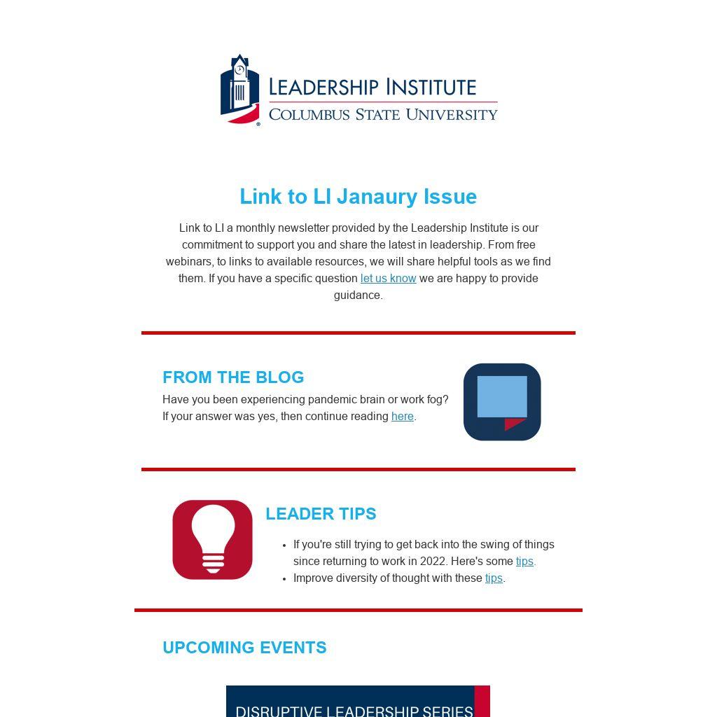 Link to LI a monthly newsletter provided by the Leadership Institute is our commitment to support you and share the latest in leadership. From free webinars, to links to available resources, we will share helpful tools as we find them. If you have a specific question let us know we are happy to provide guidance.