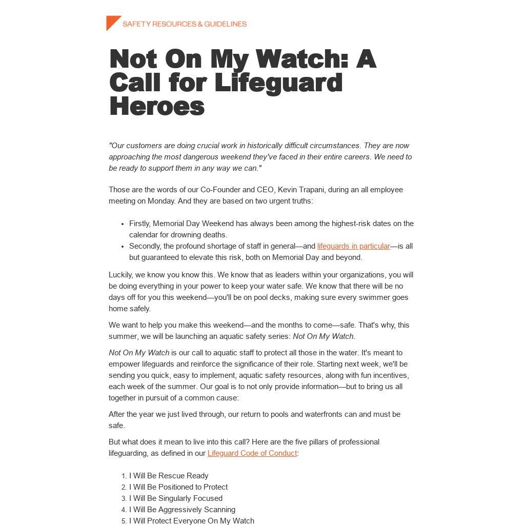 Not On My Watch is our call to aquatic staff to protect all those in the water. It's meant to empower lifeguards and reinforce the significance of their role. Starting next week, we'll be sending you quick, easy to implement, aquatic safety resources, along with fun incentives, each week of the summer. Our goal is to not only provide information—but to bring us all together in pursuit of a common cause: