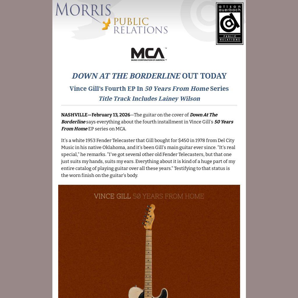 NASHVILLE—February 13, 2026—The guitar on the cover of Down At The Borderline says everything about the fourth installment in Vince Gill's 50 Years From Home EP series on MCA.