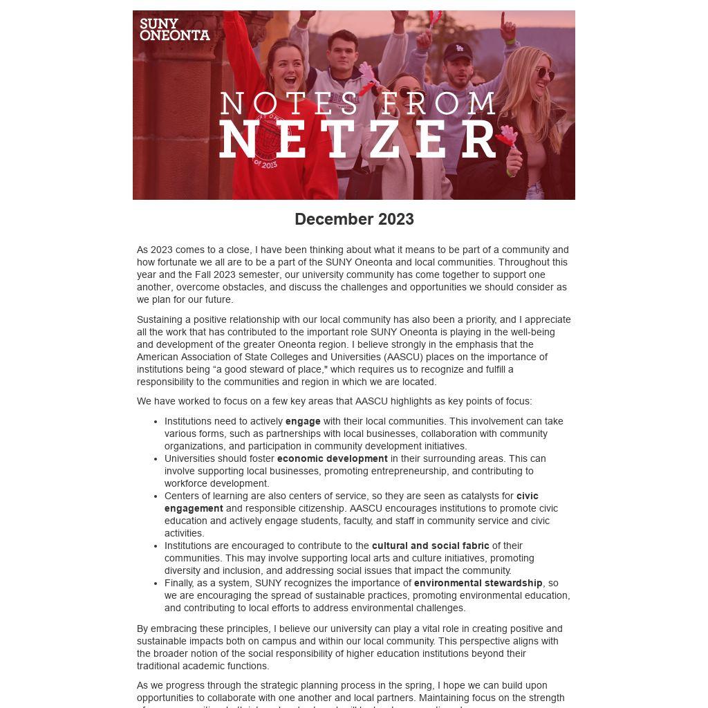 Notes from meetings of the President's Cabinet are shared with the university community monthly in Notes from Netzer. Questions can be directed to president@oneonta.edu.
