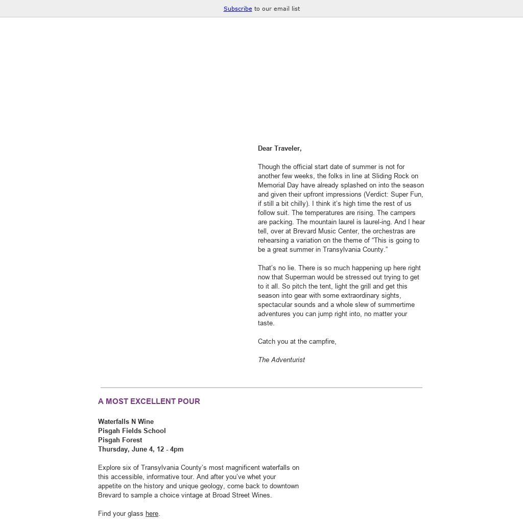 Though the official start date of summer is not for another few weeks, the folks in line at Sliding Rock on Memorial Day have already splashed on into the season and given their upfront impressions (Verdict: Super Fun, if still a bit chilly). I think it’s high time the rest of us follow suit. The temperatures are rising. The campers are packing. The mountain laurel is laurel-ing. And I hear tell, over at Brevard Music Center, the orchestras are rehearsing a variation on the theme of “This is going to be a great summer in Transylvania County.”