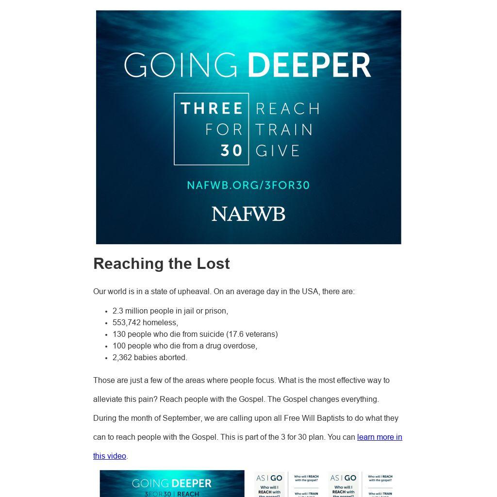 Those are just a few of the areas where people focus. What is the most effective way to alleviate this pain? Reach people with the Gospel. The Gospel changes everything.During the month of September, we are calling upon all Free Will Baptists to do what they can to reach people with the Gospel. This is part of the 3 for 30 plan. You can learn more in this video.