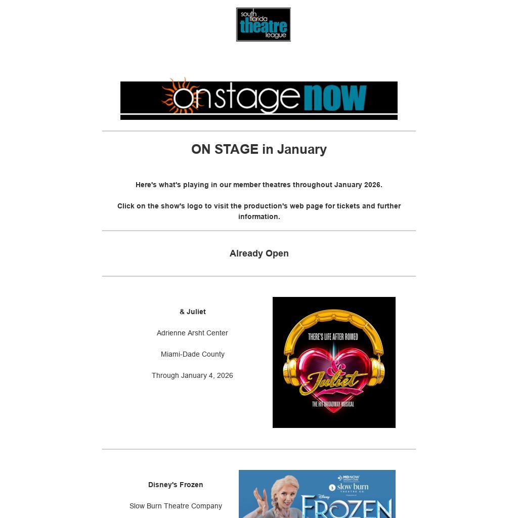 Here's what's playing in our member theatres throughout January 2026. Click on the show's logo to visit the production's web page for tickets and further information.