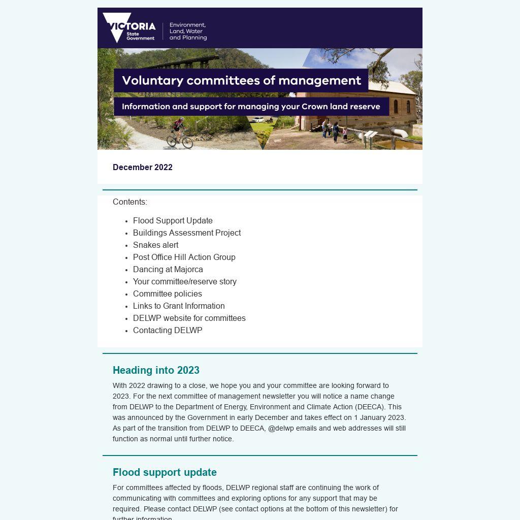 Heading into 2023With 2022 drawing to a close, we hope you and your committee are looking forward to 2023. For the next committee of management newsletter you will notice a name change from DELWP to the Department of Energy, Environment and Climate Action (DEECA). This was announced by the Government in early December and takes effect on 1 January 2023. As part of the transition from DELWP to DEECA, @delwp emails and web addresses will still function as normal until further notice.