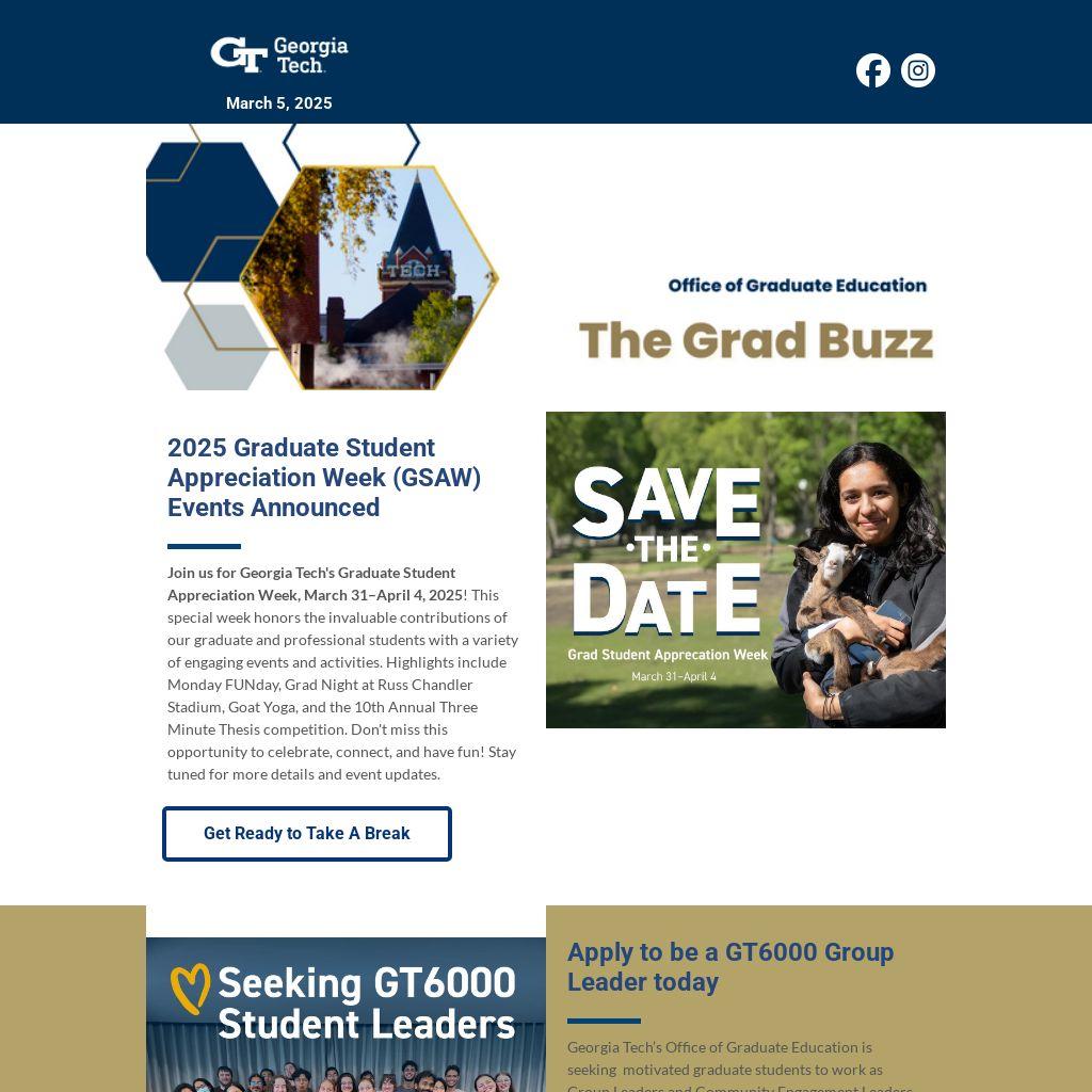 Join us for Georgia Tech's Graduate Student Appreciation Week, March 31–April 4, 2025! This special week honors the invaluable contributions of our graduate and professional students with a variety of engaging events and activities. Highlights include Monday FUNday, Grad Night at Russ Chandler Stadium, Goat Yoga, and the 10th Annual Three Minute Thesis competition. Don't miss this opportunity to celebrate, connect, and have fun! Stay tuned for more details and event updates.