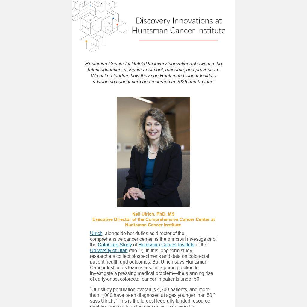 Huntsman Cancer Institute's Discovery Innovations showcase the latest advances in cancer treatment, research, and prevention. We asked leaders how they see Huntsman Cancer Institute advancing cancer care and research in 2025 and beyond. |