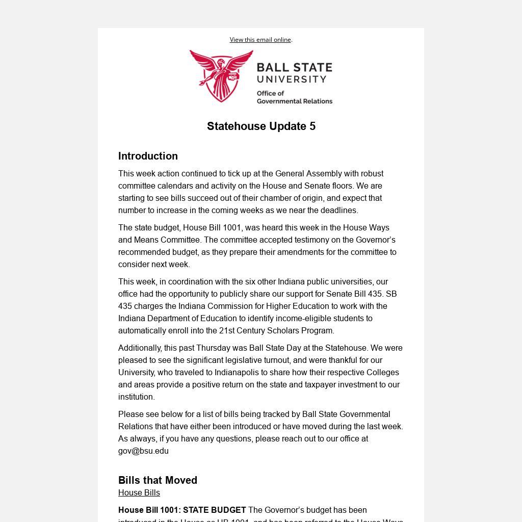 Please see below for a list of bills being tracked by Ball State Governmental Relations that have either been introduced or have moved during the last week. As always, if you have any questions, please reach out to our office at gov@bsu.edu