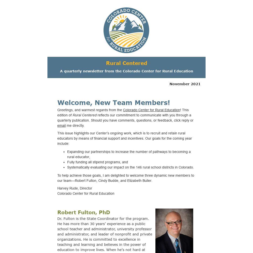 Greetings, and warmest regards from the Colorado Center for Rural Education! This edition of Rural Centered reflects our commitment to communicate with you through a quarterly publication. Should you have comments, questions, or feedback, click reply or email me directly.